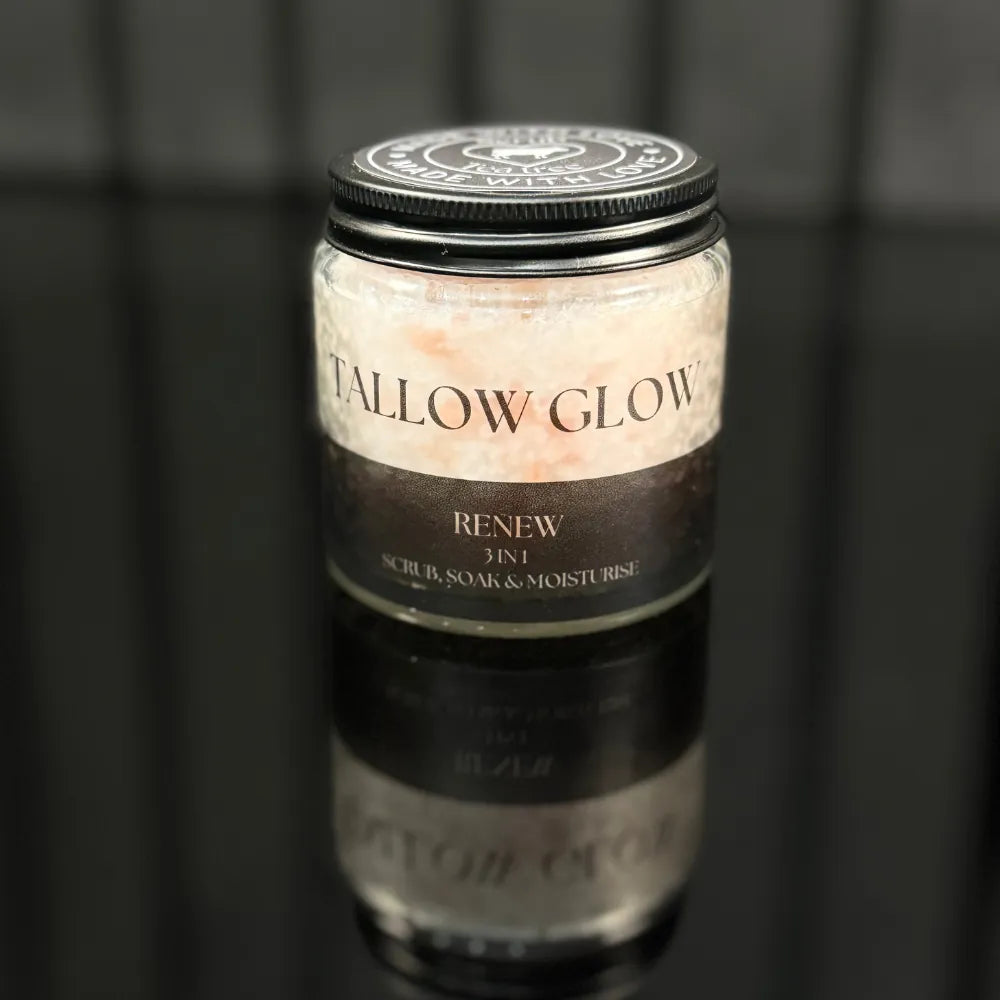 Indulge in the ultimate skin renewal ritual with Renew by Tallow Glow. This luxurious 3-in-1 formula combines a gentle scrub, a revitalising soak, and a deep moisturiser in one easy step. Expertly crafted with a blend of mineral-rich salts and deeply nourishing grass-fed tallow, it buffs away dull skin, replenishes vital nutrients, and locks in long-lasting hydration—leaving you with a luminous, healthy glow.